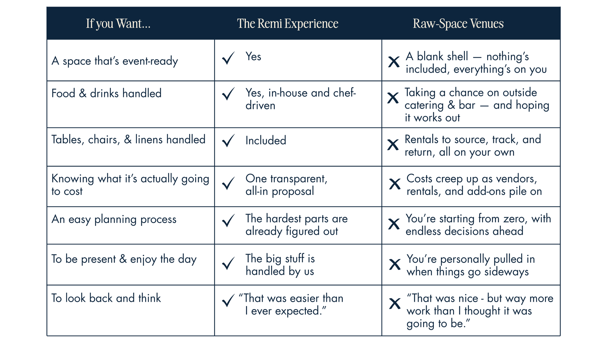 At Remi, your event is half-planned the moment you book. With so much already handled in-house, planning is simple and celebrating comes easy.